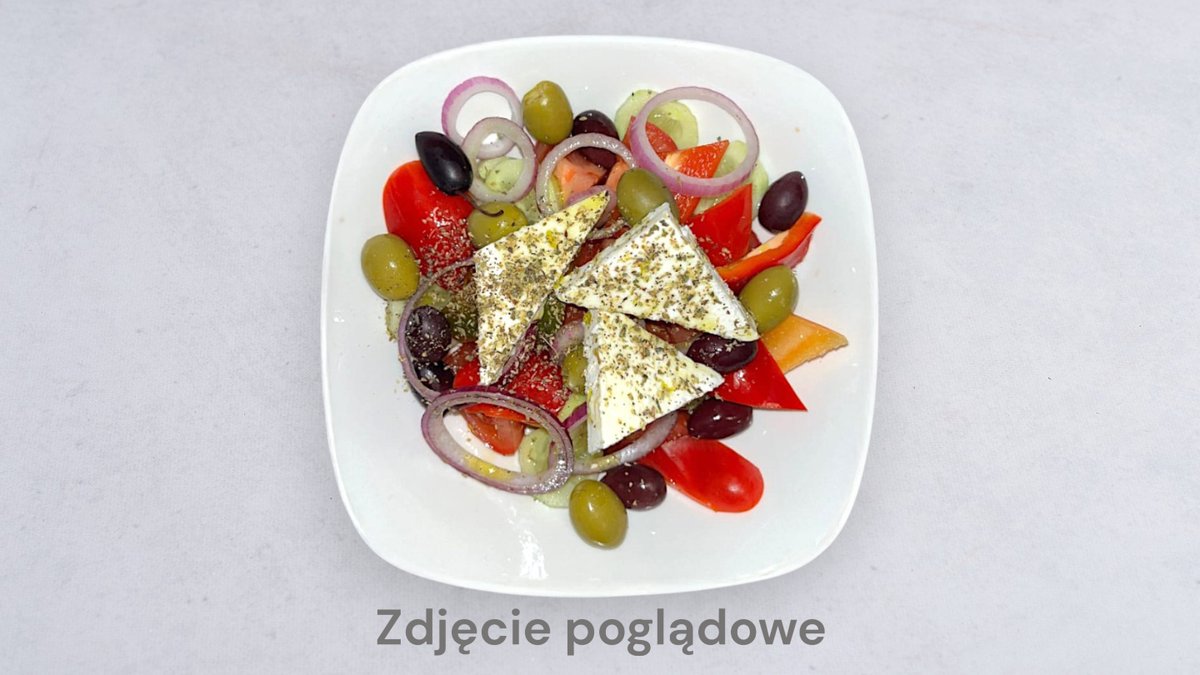Sałata, papryka, pomidor, ogórek, oliwki, cebula, ser feta, sos winegret