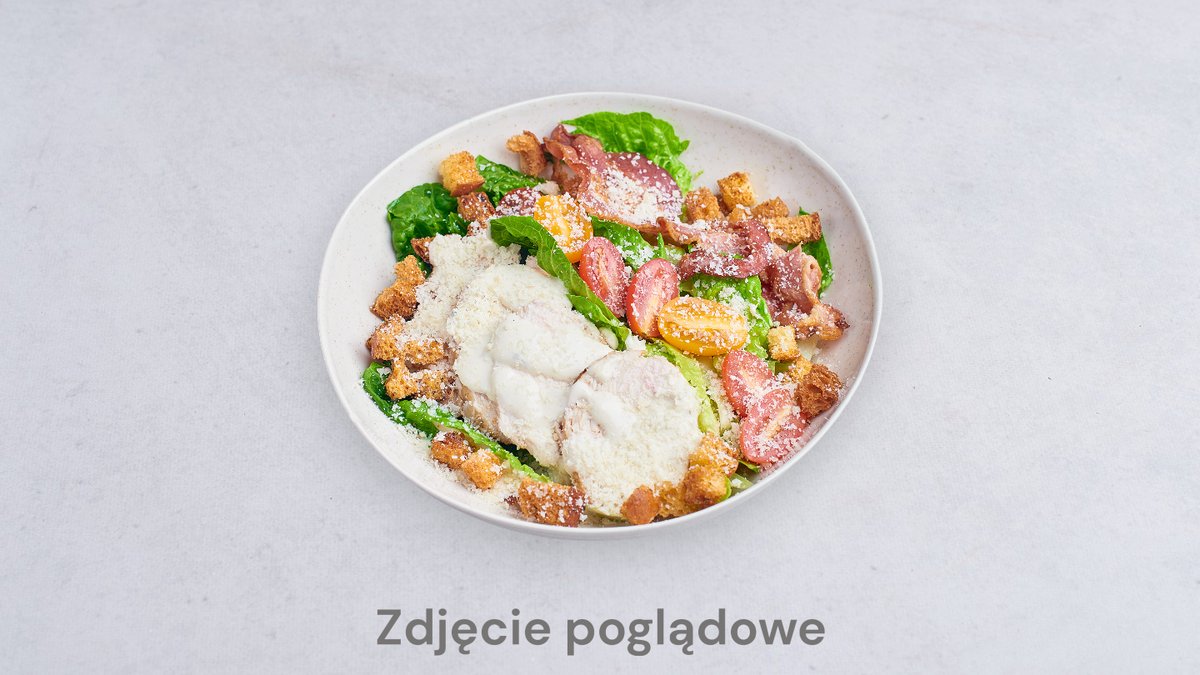 Sałata, papryka, pomidor, ogórek, kurczak, grzanki, parmezan, sos miodowo-musztardowy