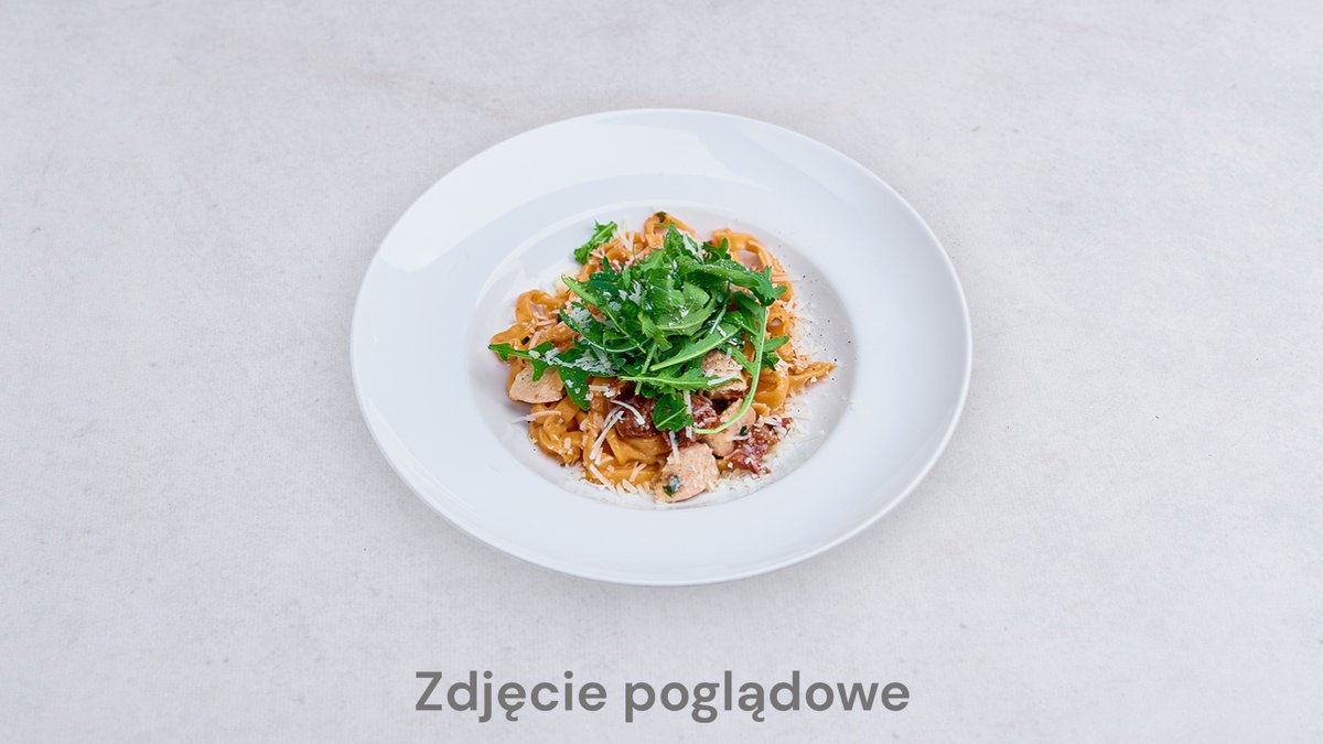 Makaron tagliatelle, sos śmietanowy, kurczak, smażone kurki, suszone pomidory, cebula, parmezan