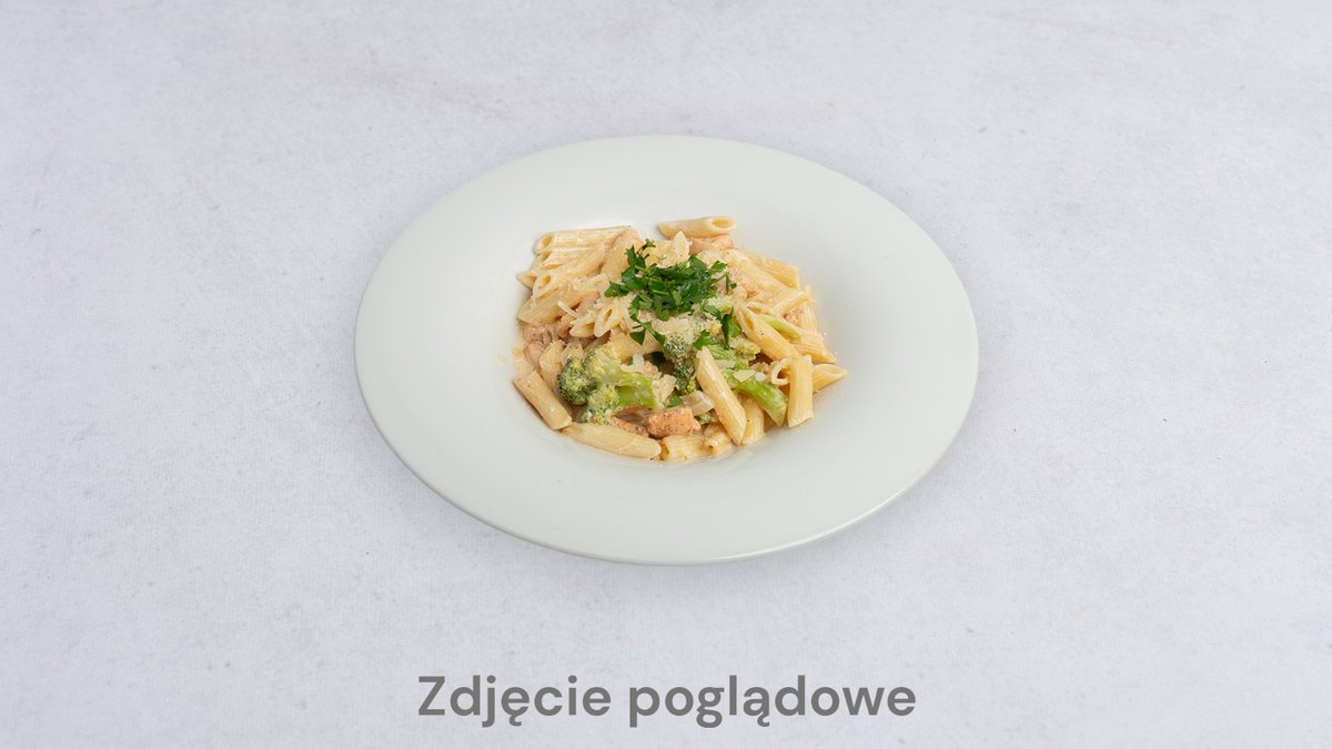 Makaron penne, sos śmietanowy, łosoś, cukinia, cebula, ser