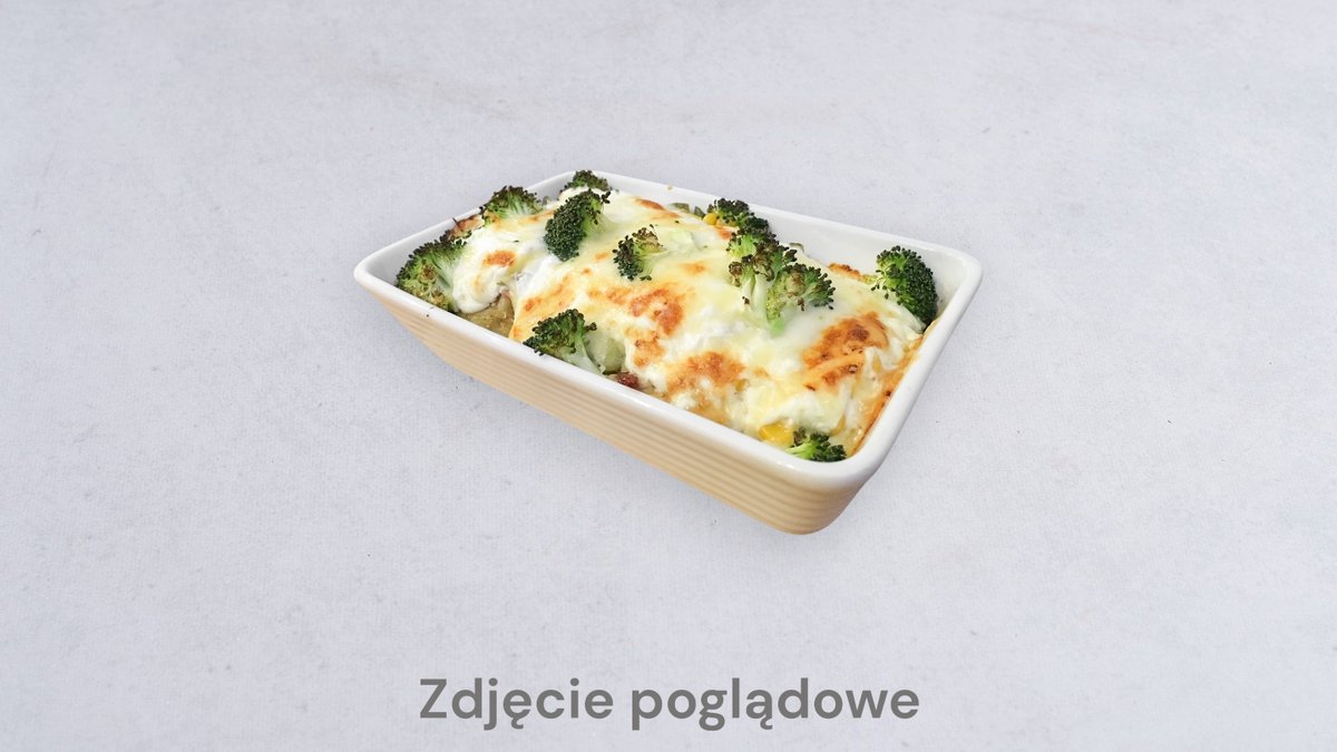 Placek ziemniaczany, sos śmietanowo serowy, kurczak, pieczarki, brokuł, pietruszka, ser
