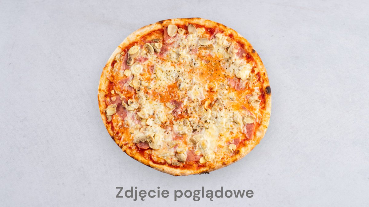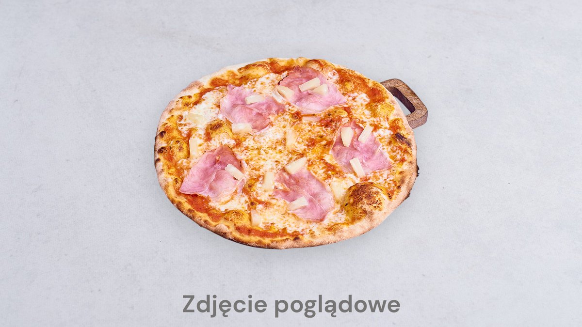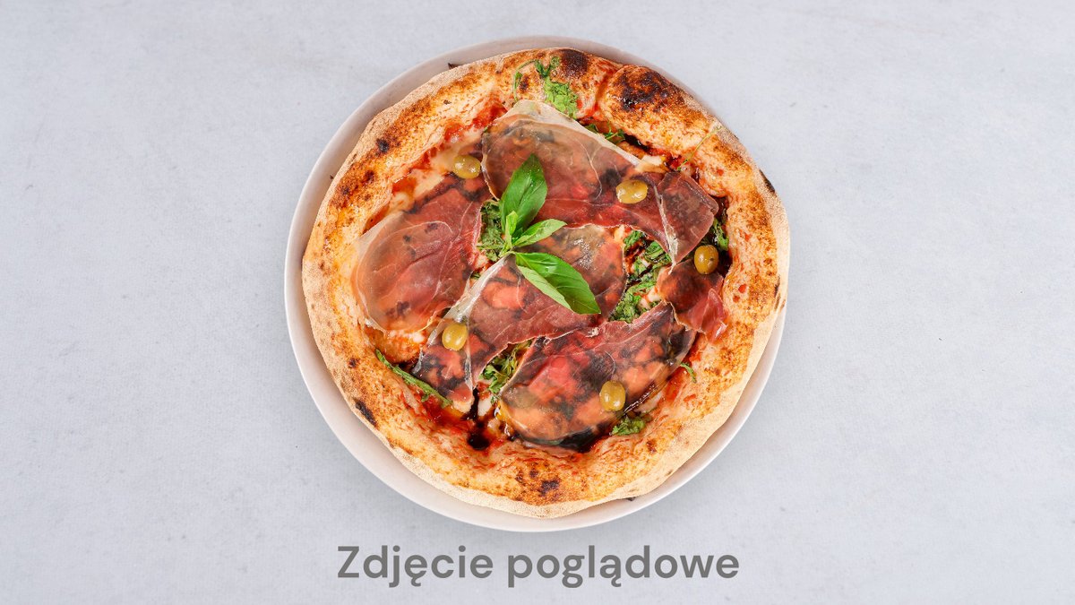 Sos pomidorowy, szynka parmeńska, pomidorki koktajlowe, rukola, parmezan, ser