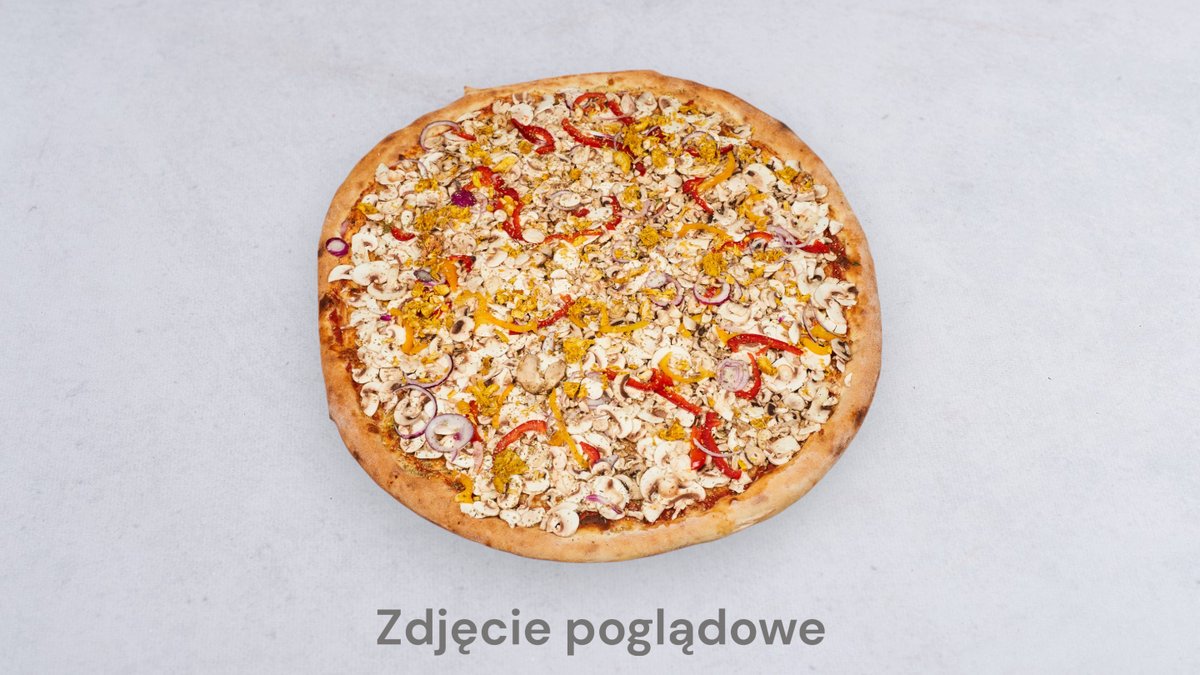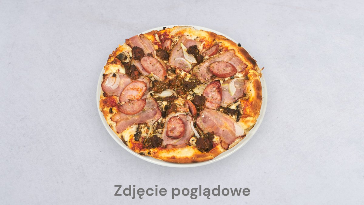 Placek ziemniaczany, sos pomidorowy, mięso mielone wieprzowe, papryka czerwona, cebula, kukurydza, jalapenio, ser