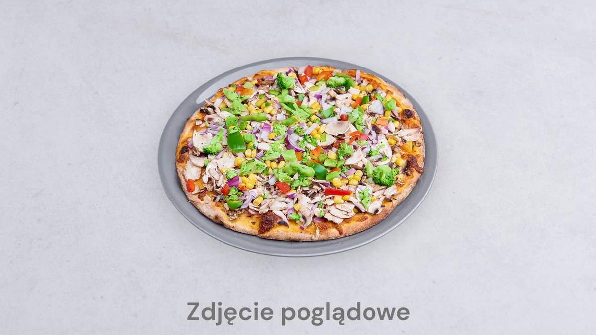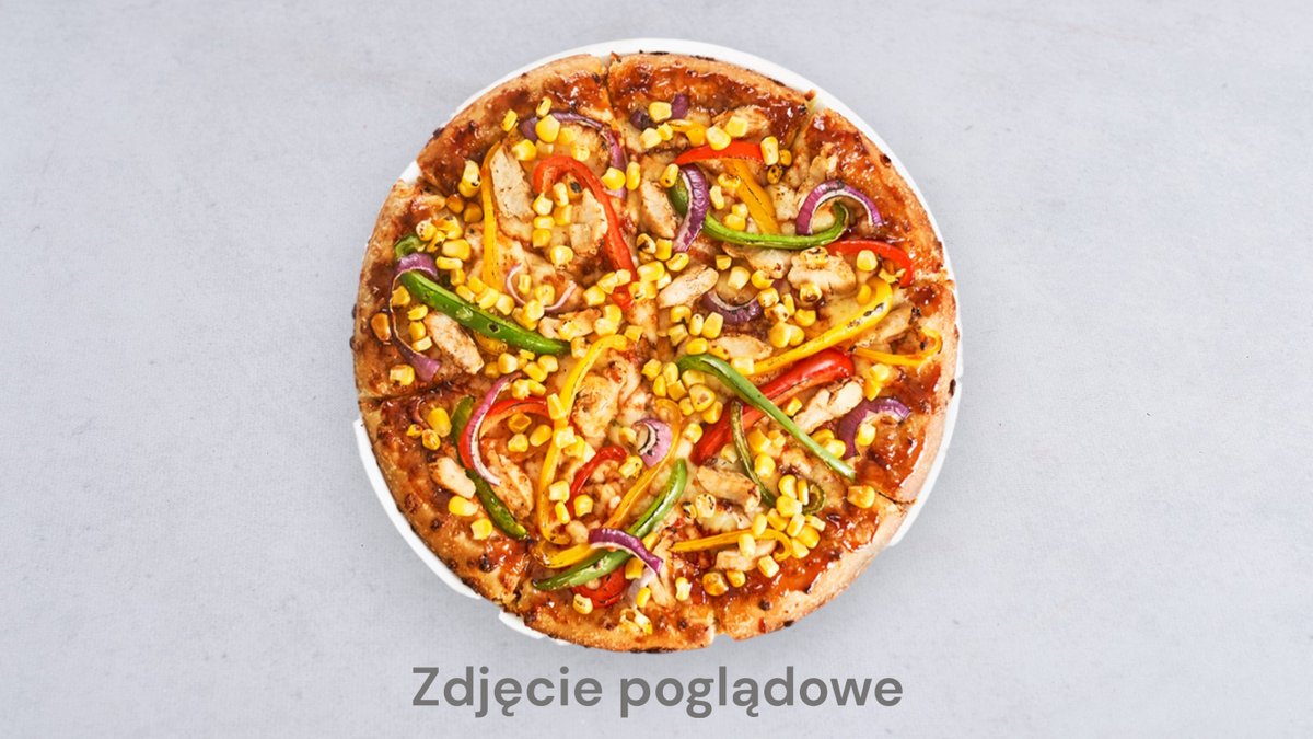 Placek ziemniaczany, salsa meksykańska, kurczak, papryka czerwona, cebula, kukurydza, fasola czerwona, ser