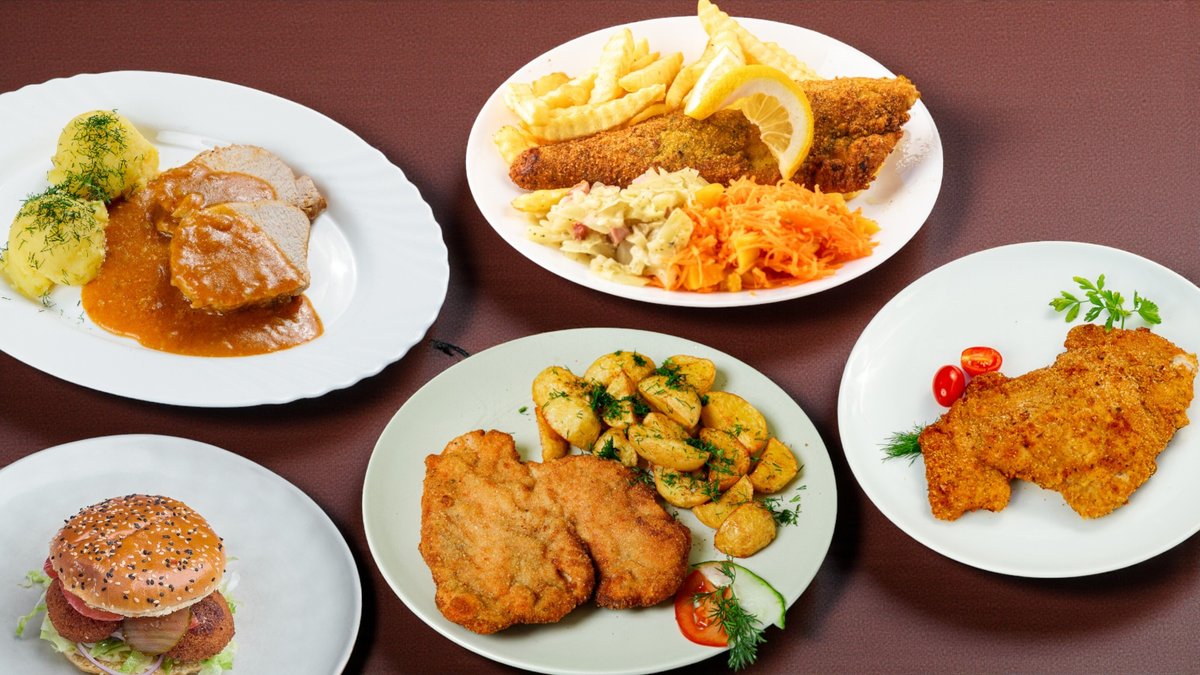 Sandacz z złocistej panierce, frytki, zestaw surówek