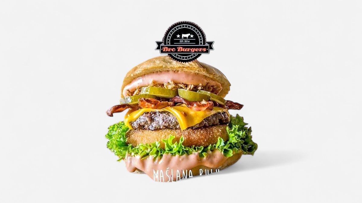 Świeża wołowina, sałata, ser, sos majo-sriracha, grillowany boczek, nasze ogórki kiszone, prażona cebulka, panierowany ser, maślana bułka Zdjęcie poglądowe