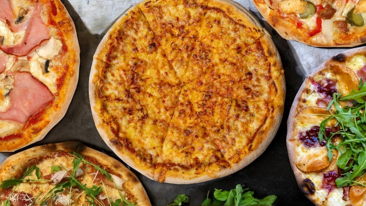 Ser, sos pomidorowy, pieczarki, szynka, ogórek konserwowy, papryka konserwowa, kukurydza słodka, cebula
