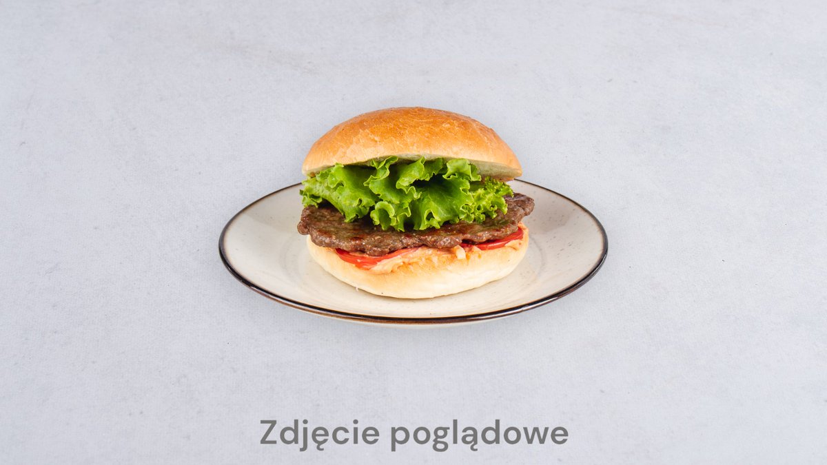 Bułka pszenna, kotlet drobiowo-wieprzowy sos, mix sałat, ogórek, pomidor