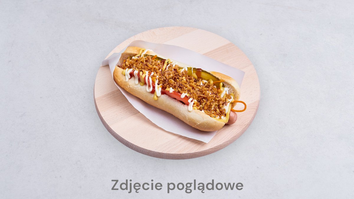 Bułka pszenna, parówka, mix sałat, sos, ogórek, pomidor, cebulka prażona