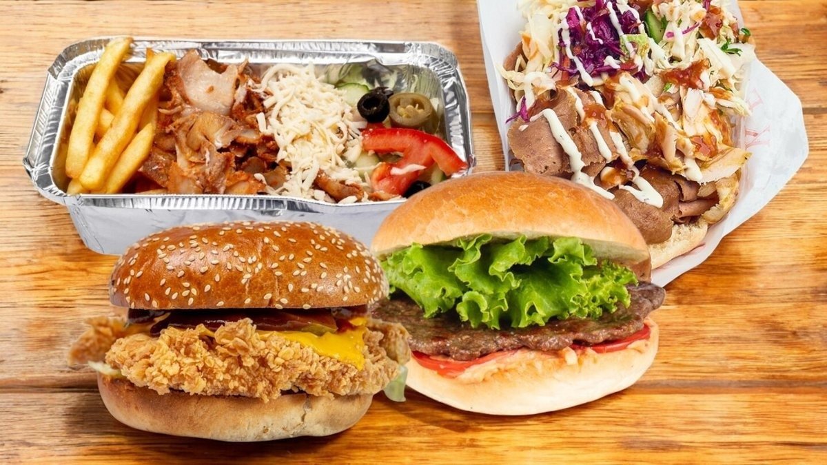 Mięso, sos, bułka, mix sałat, ogórek, pomidor, frytki.