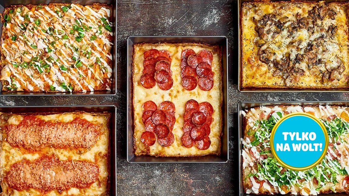 Amerykańska pizza w kształcie kwadratu. Nasyci każdy apetyt. Soczyste, świeże składniki