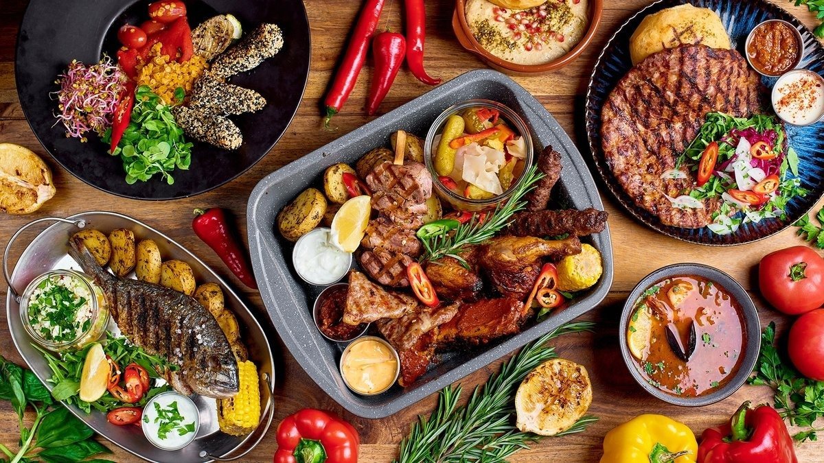 Hummus Trio / salami Spinata / szynka Crudo / oliwki wędzone / oliwki kalamata / ljuta papricica / chutney z czerwonej cebuli / ogórki kiszone w sosie miodowo-imbirowym z chilli / czosnkiem i cytryną / pasta Baba ghanoush / pieczone karmelizowane warzywa / ajvar / kajmak / pieczywo bałkańskie