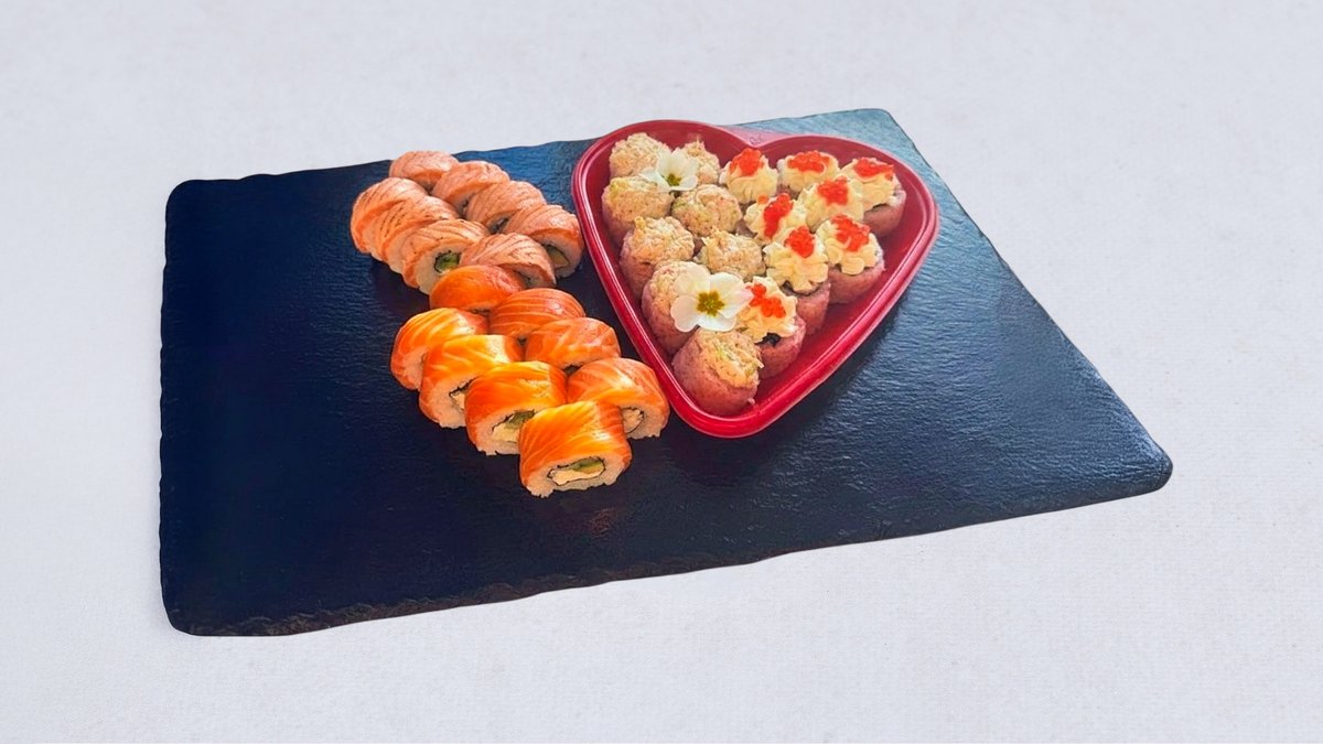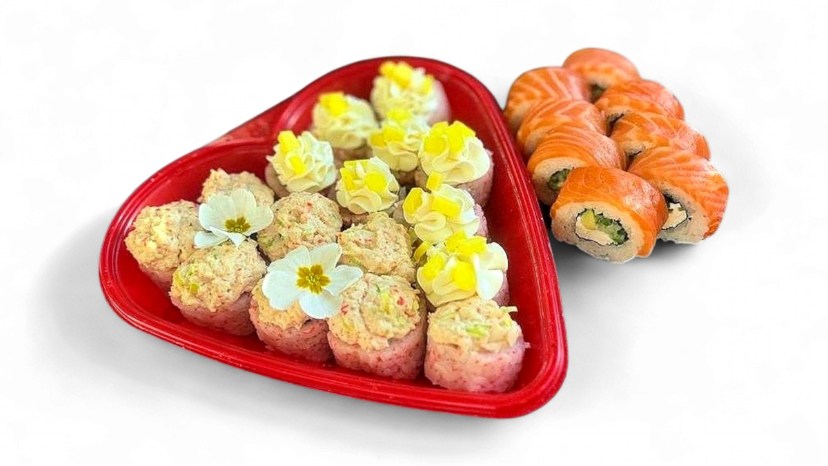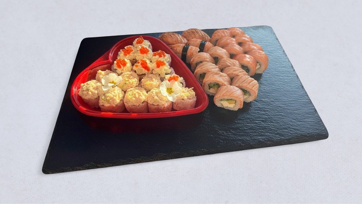 8× California Gold z łososiem opalanym, 8× California Gold z łososiem, nigiri z opalanym łososiem – 2 szt., nigiri z krewetką – 2 szt. 8× California z sałatką surimi z kawiorem (sałatka z surimi, tobiko, por, majonez, sos Sriracha, serek, wakame goma), 8× California z pieczonym łososiem (łosoś pieczony, serek, awokado, tobiko, oshinko).