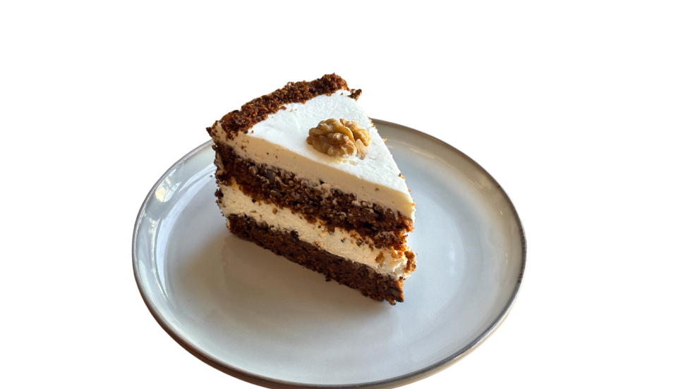 Wilgotne ciasto marchewkowe, z dodatkiem orzechów włoskich, przekładane kremowym serkiem.