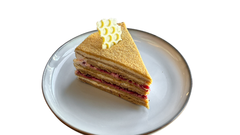 Kruche blaty ciasta miodowego, przełożone kremem na bazie kwaśniej śmietany. Z dodatkiem konfitury żurawinowej oraz białej czekolady.