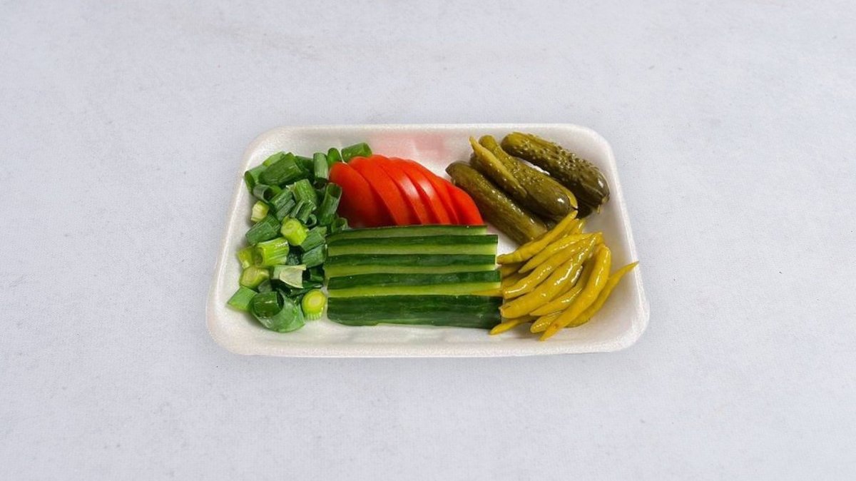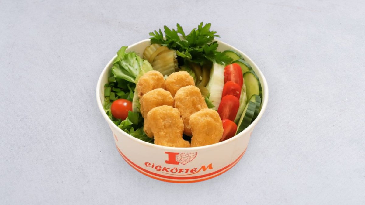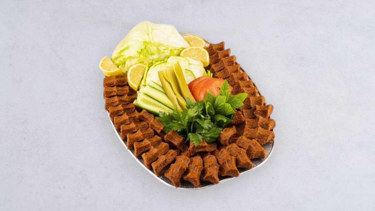 100 szt çiğköfte, 2 opakowania sałat - cytryna, pietruszka, dymka, pomidor, ogórek, pikle, kukurydza, 10 szt. lavas, sos granata (Çiğköfte to tradycyjna, wegetariańska przekąska przygotowana z bulguru i wielu zdrowych przypraw, bogata w witaminy i błonnik, podawana na zimno.)