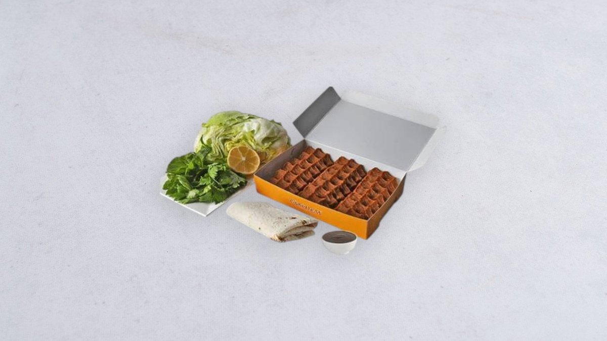 10 szt çiğköfte, opakowania sałat - cytryna, 2 szt. lavas, sos granata. (Çiğköfte to tradycyjna, wegetariańska przekąska przygotowana z bulguru i wielu zdrowych przypraw, bogata w witaminy i błonnik, podawana na zimno.)