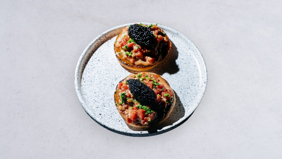 Angielski muffin, kawior z wodorostów, czosnek czarny