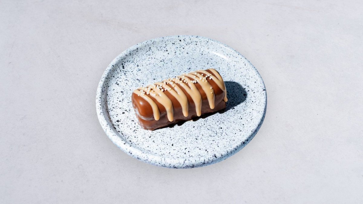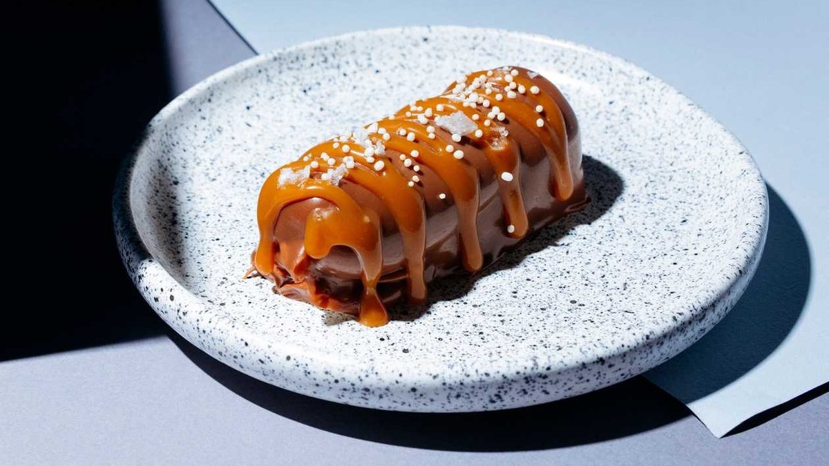 Twarogowo-śmietanowy deser glazurowany belgijską czekoladą, solonym karmelem i ryżowymi kuleczkami