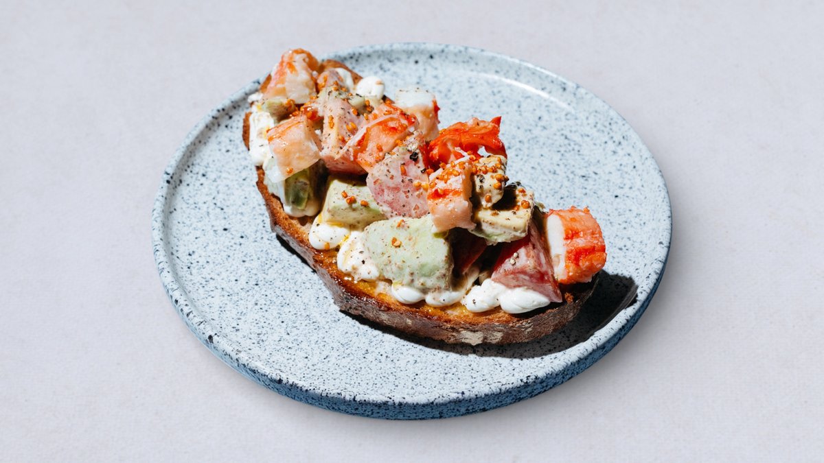 Chrupiący tost, krab, awokado, pomidor, sos sezamowy, oliwa z oliwek, masło, sezam kimchi.