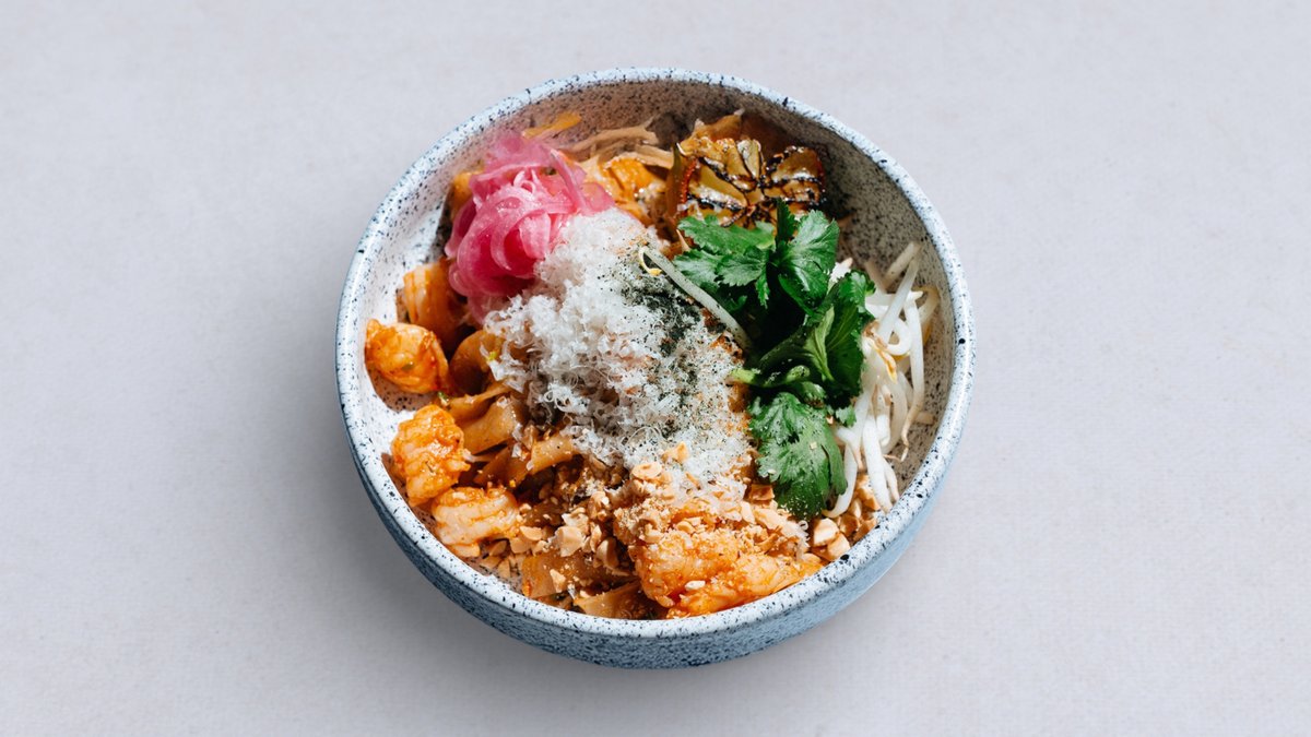 Makaron ryżowy, krewetki, jajko, sos Pad Thai, bok choy, kiełki fasoli mung, wakame, marynowana cebula, orzeszki ziemne, kolendra, limonka, parmezan.