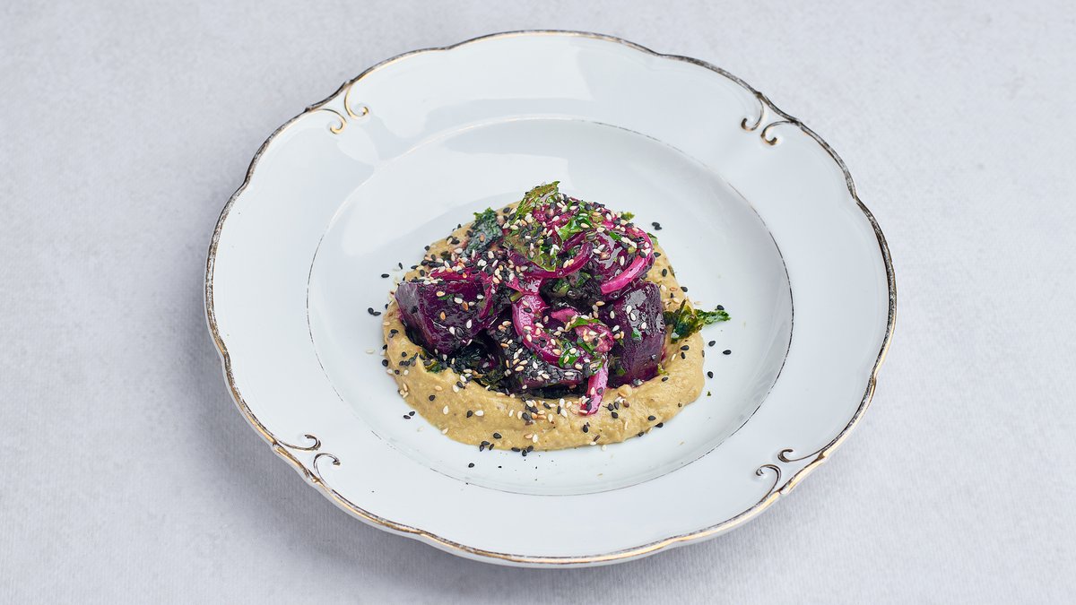 baba ghanoush, roasted beetroot, red onion,peperoni, mint, coriander, chives, honey, sherry vinegar, lemon, pepper, garlic, eggplant (bakłażan), tahini, cumin, Ras el hanout, mayonnaise, sesame, nori, Maldon salt