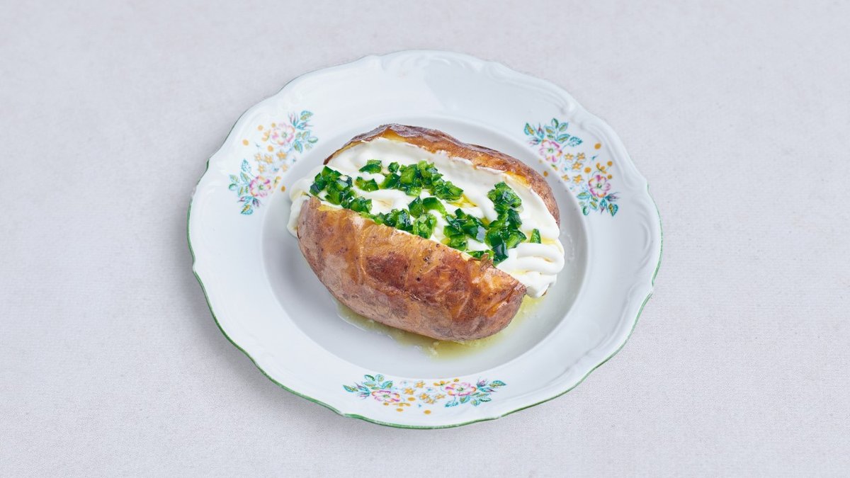 pieczony ziemniak, masło, creme fraiche, oliwa, jalapeno, Maldon