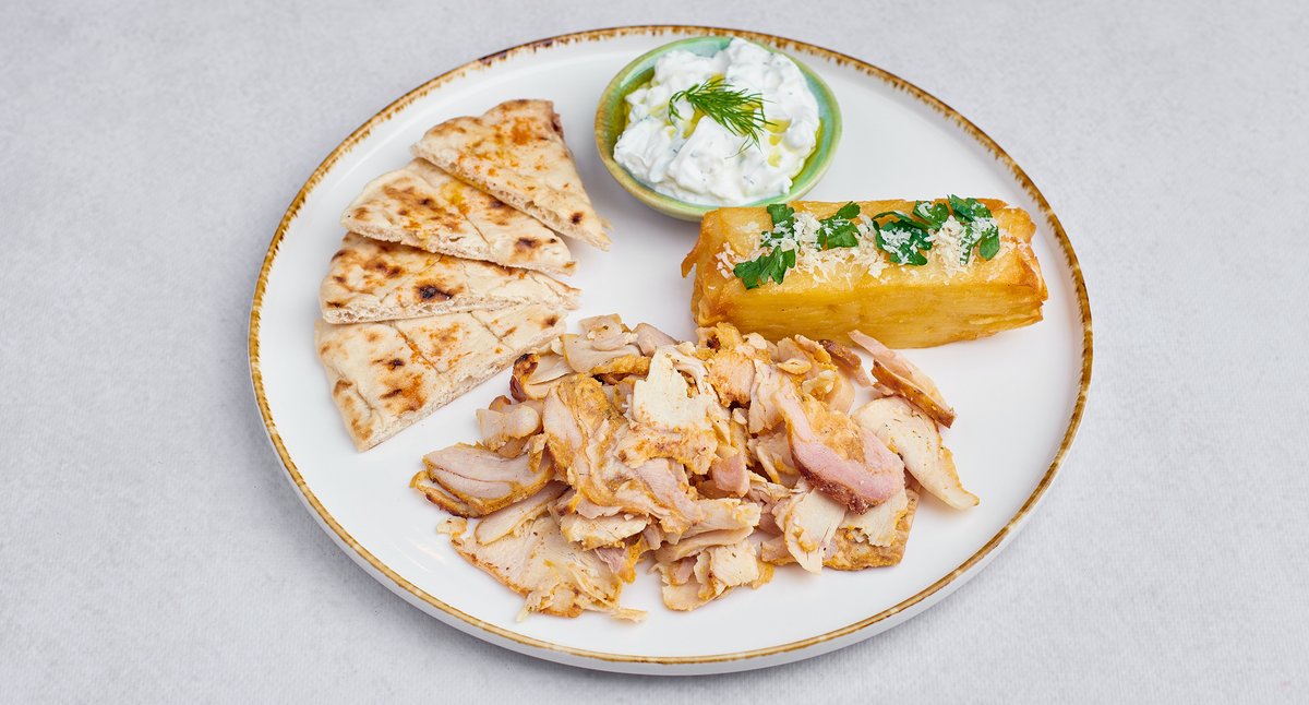 Gyros z kurczaka podawany z frytkami, pomidorami, cebulą, pitą i tzatziki