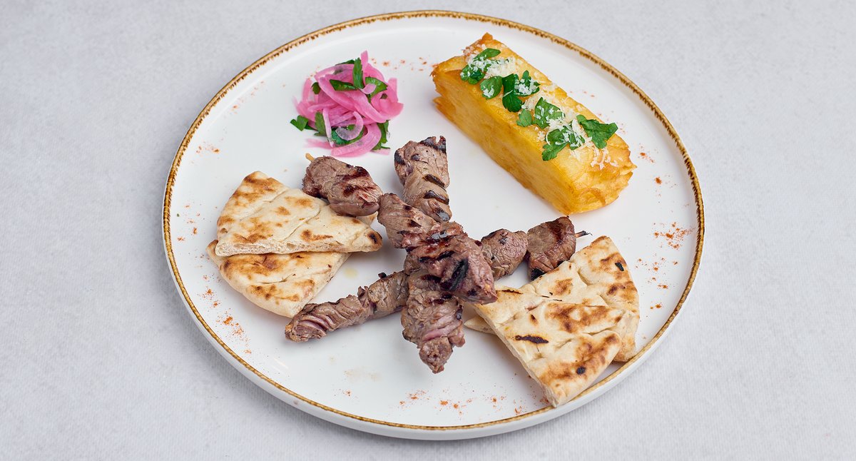 Delikatne szaszłyki wołowe, marynowane w oliwie z oliwek, czosnku, oregano i cytrynie, grillowane do perfekcji, podawane z chlebem pita i tzatziki
