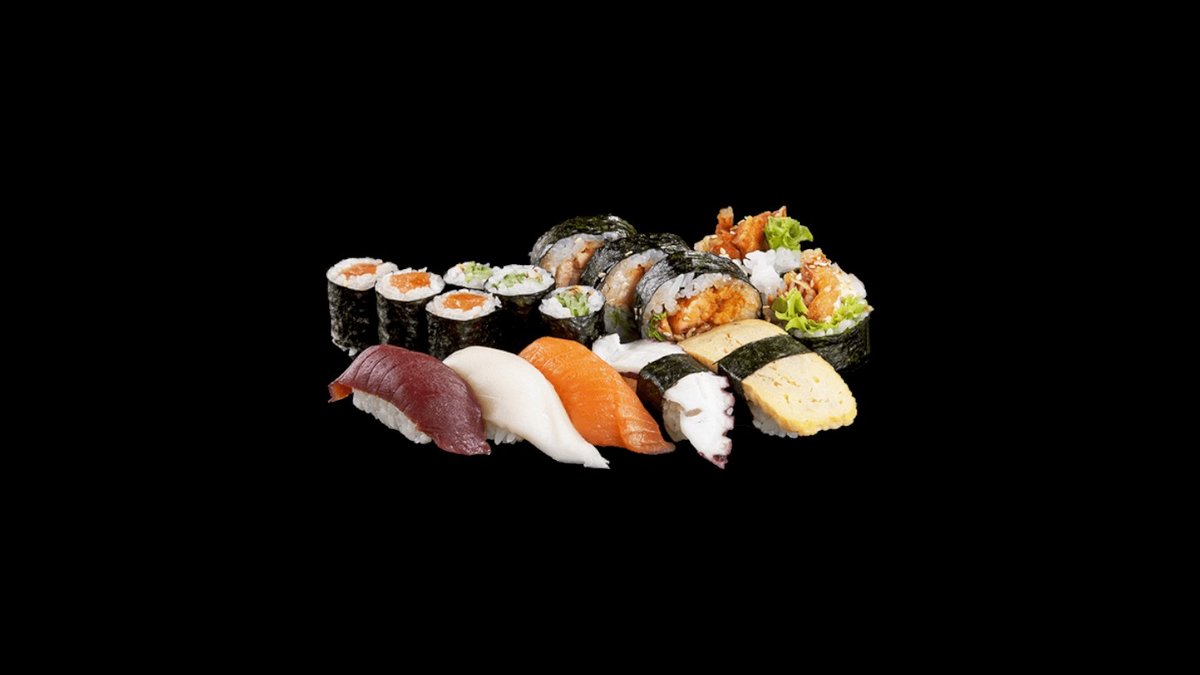 8 nigiri: tuńczyk, maślana, łosoś, omlet tamago 5 california pieczony łosoś 6 california łosoś 3 hosomaki łosoś 3 hosomaki ogórek