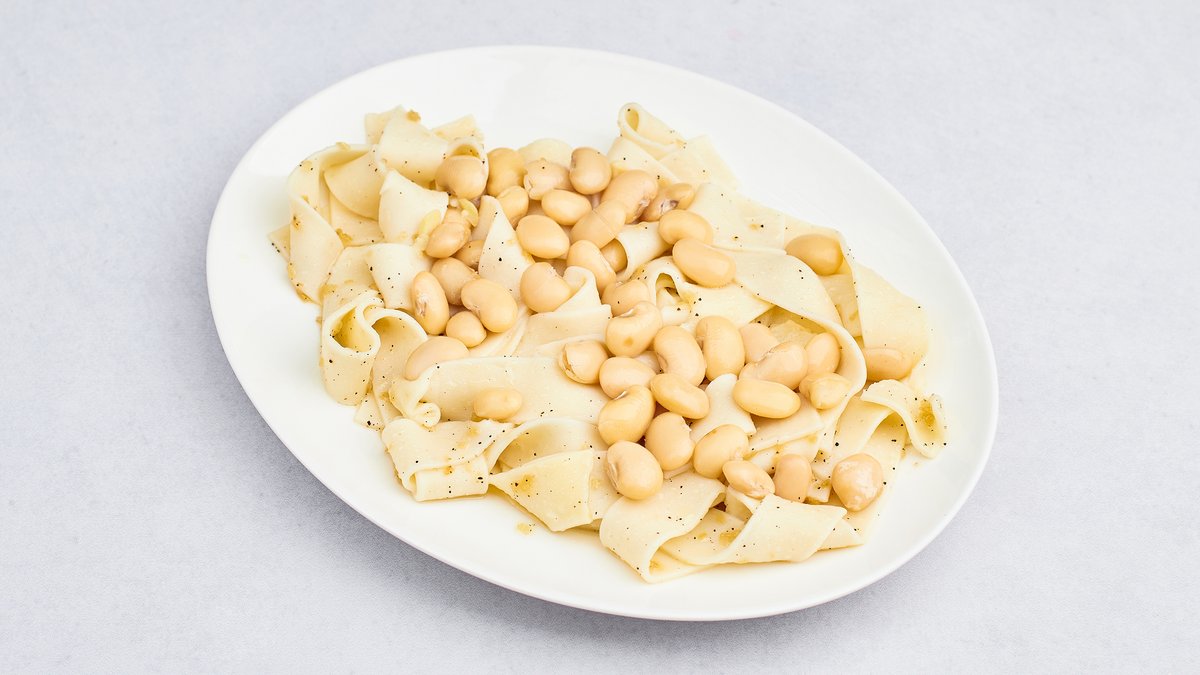 Domowy makaron ze smażoną na maśle cebulą i fasolą. Podawany z sosem jogurtowym z czosnkiem. Niezwykle smaczne połączenie.