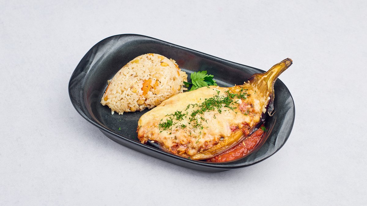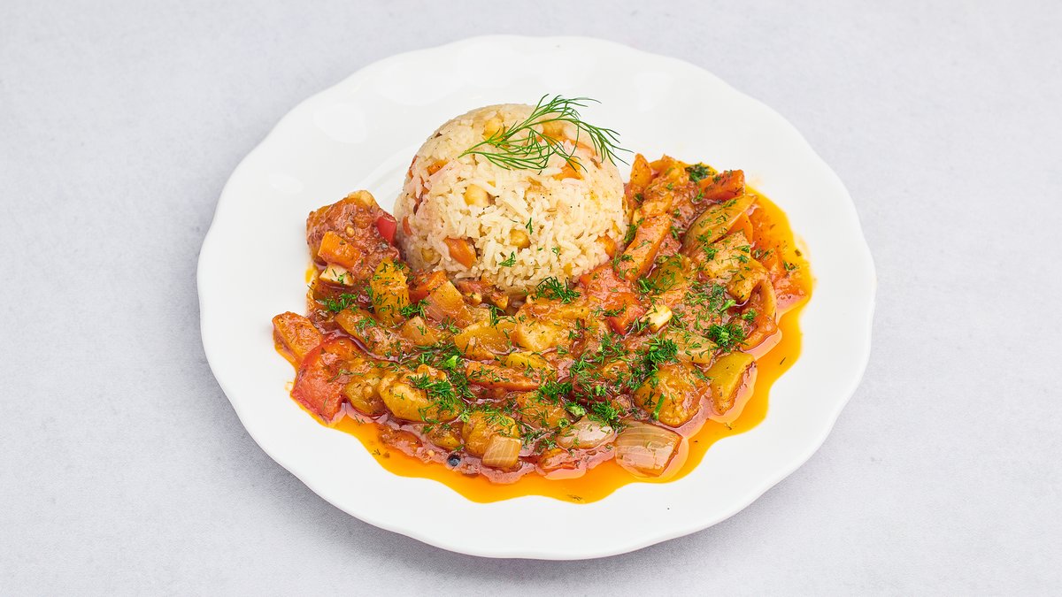 Ryż, bakłażan, marchew, cebula, papryka, pomidor, dodatek