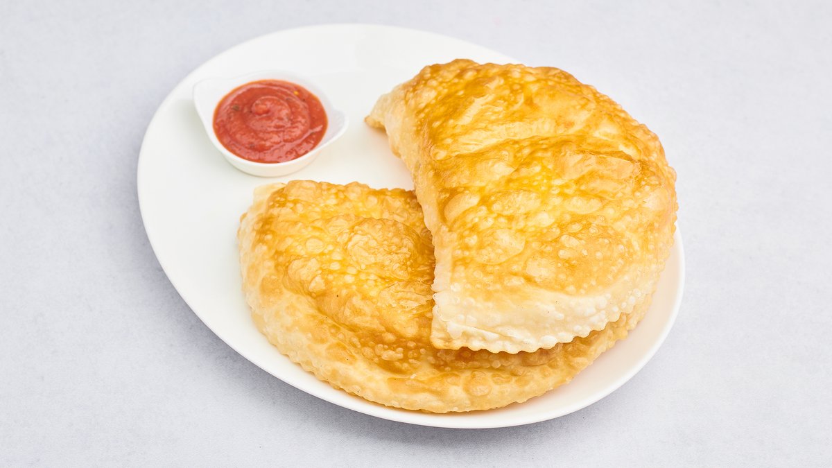 Dwa tradycyjne placki z ciasta przaśnego z mieloną wołowiną, cebulą i przyprawami. Przygotowane w głębokim oleju. Podane z sosem pomidorowym.