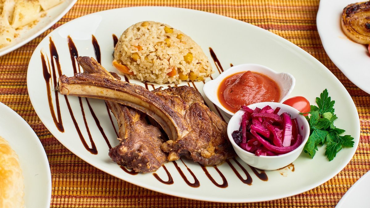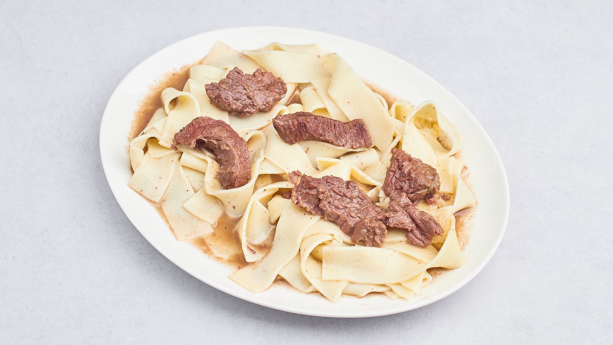 Domowy makaron z duszoną wołowiną, sos jogurtowy z czosnkiem. Danie popularne wśród tatarów ze stepowej części Krymu.