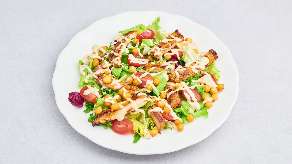 Mix salat, pomidorki koktajlowe, kurczak grill, groszek ptysiowy, sos firmowy.