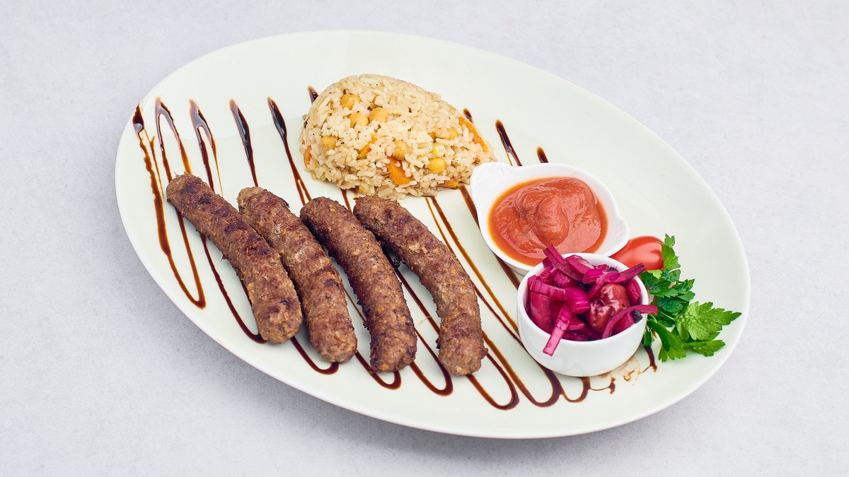 Tradycyjny kebab z mielonej wołowiny. Podawany z dodatkiem, sałatką i sosem