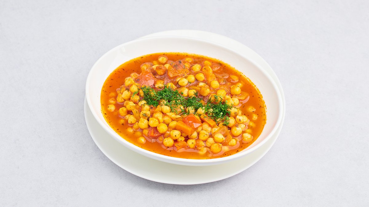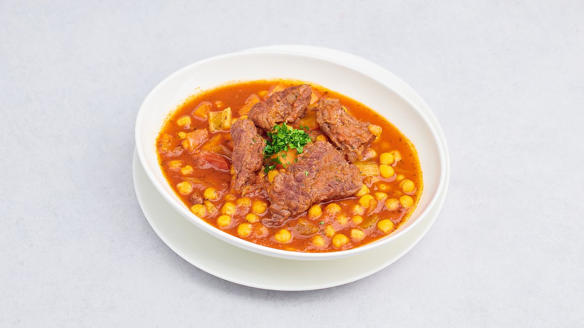 Duszona wołowina z ciecierzycą, papryką, marchewką, pomidorami i cebulą.