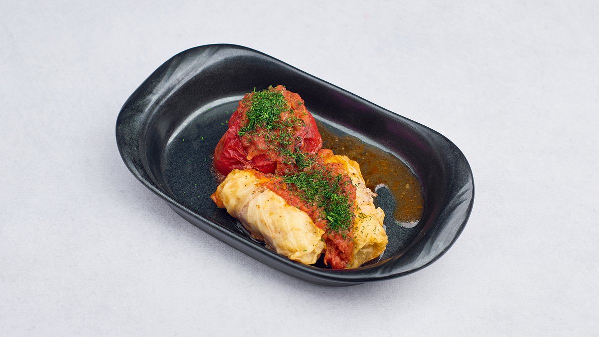 Papryki nadziewane mięsem, ryżem i warzywami w sosie własnym. Mięso mielone wołowe z ryżem i przyprawami zawijane w liście kapusty. Polewa pomidorowa