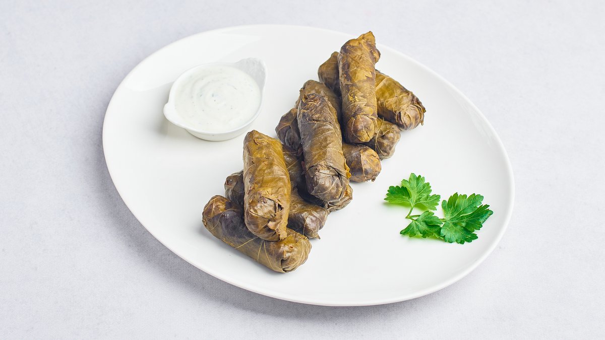 Mięso mielone wołowe z ryżem i przyprawami zawijane w liście winogron. podawane z sosem jogurtowym