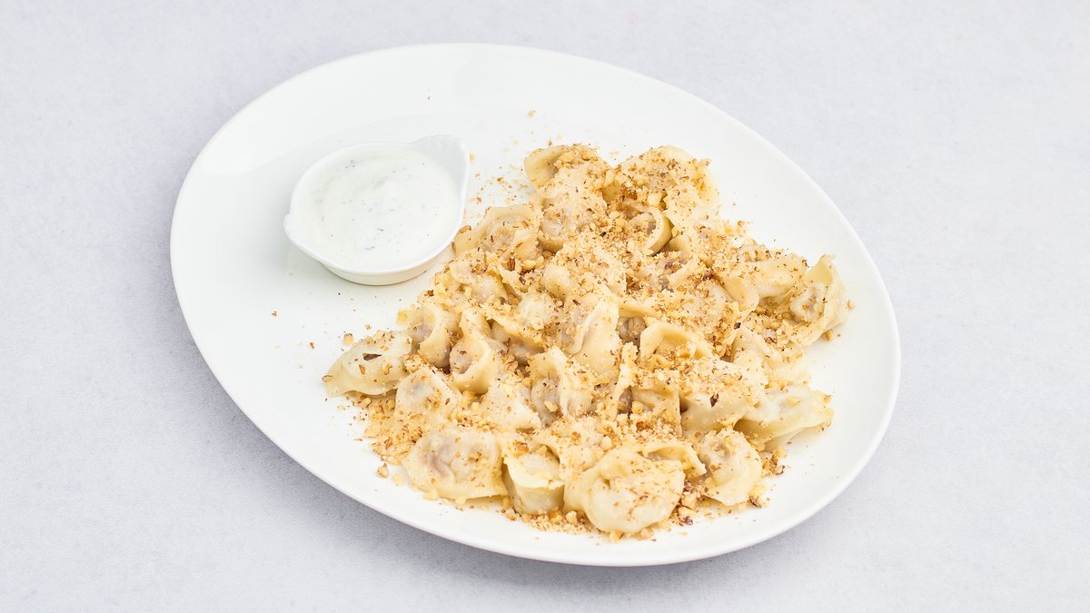 Pierogi z mięsem wołowym, orzechy włoski, smażona cebula, sos jogurtowy
