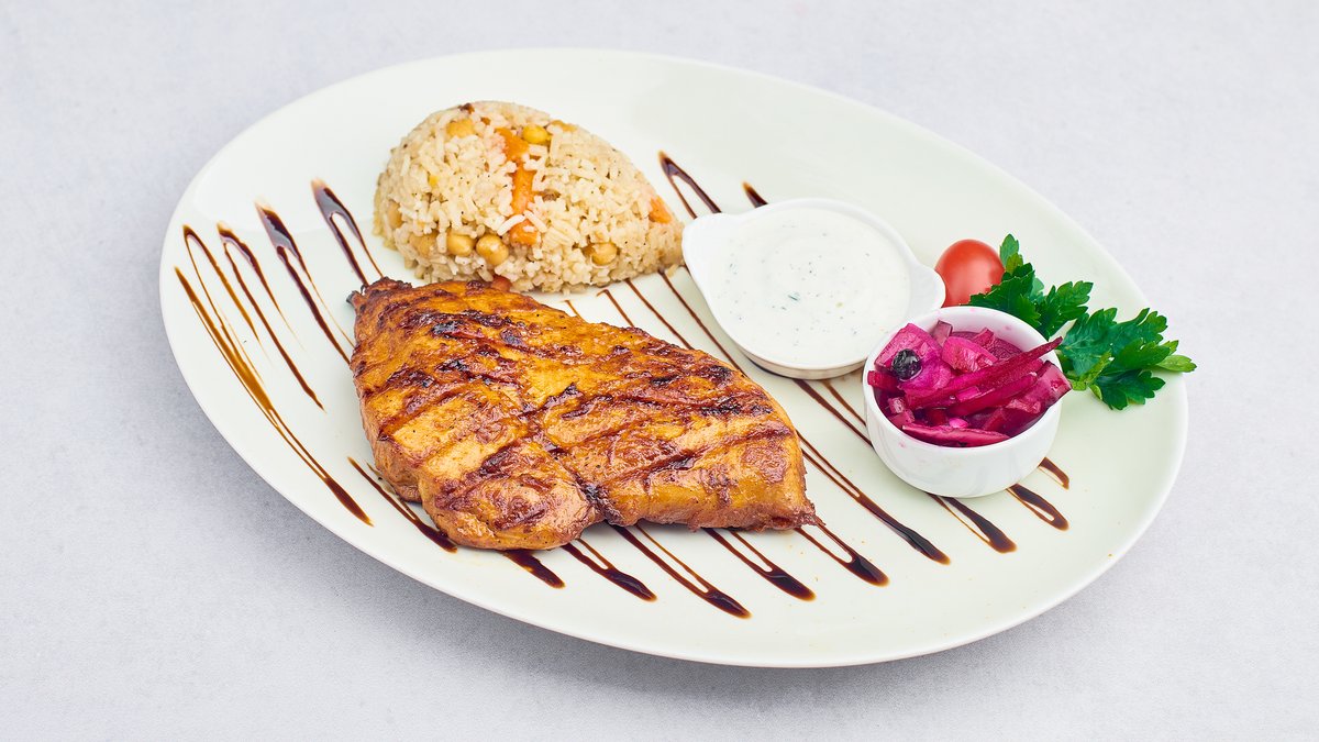 Grillowana pierś kurczaka, dodatek, sałatką, sos