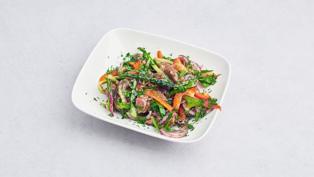 (Wołowina, papryka, ogórek, czerwona cebula, szpinak, koperek, pietruszka, kolendra, oliwa z oliwek.)