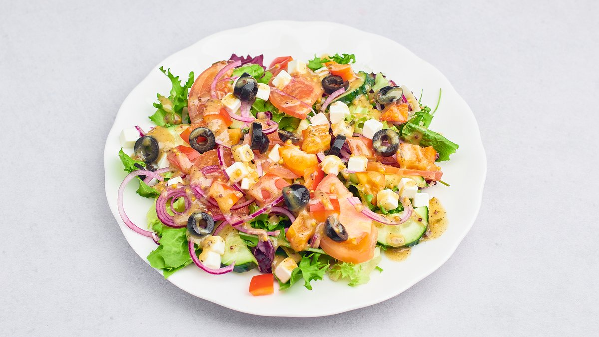 Mix salat, pomidory, papryka, ogórek, czerwona cebula, oliwki, ser, sos firmowy.