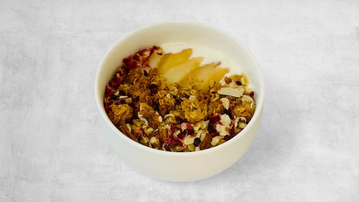 Z syropem klonowym, orzechami pekan, migdałami, orzechami włoskimi, gruszka I jogurtem sojowym lub kokosowym