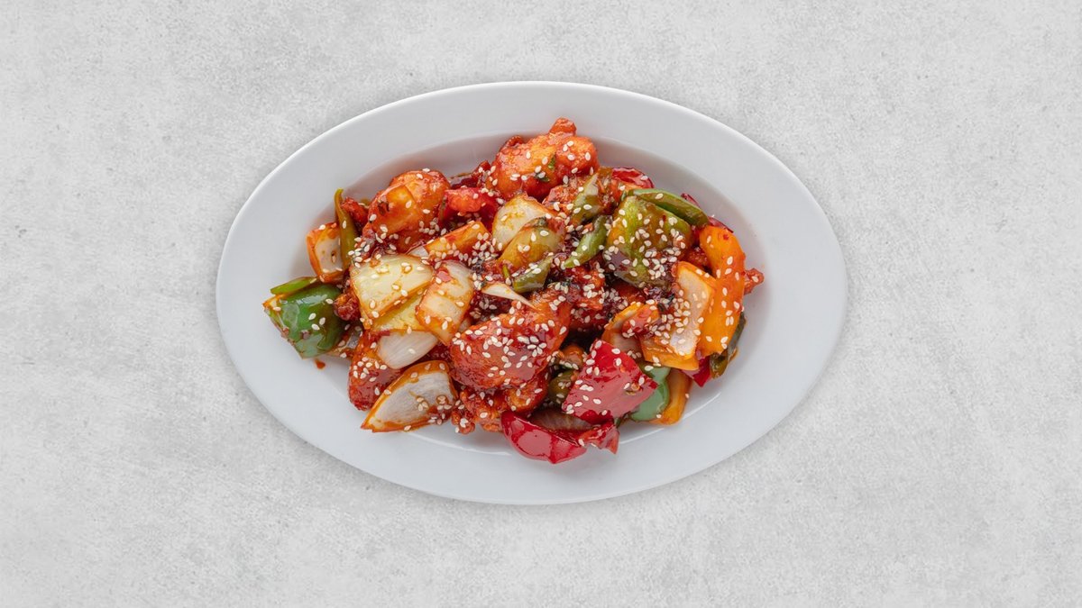 Kawałki kurczaka, jagnięciny oraz krewetki ryby w pikantnym sosie