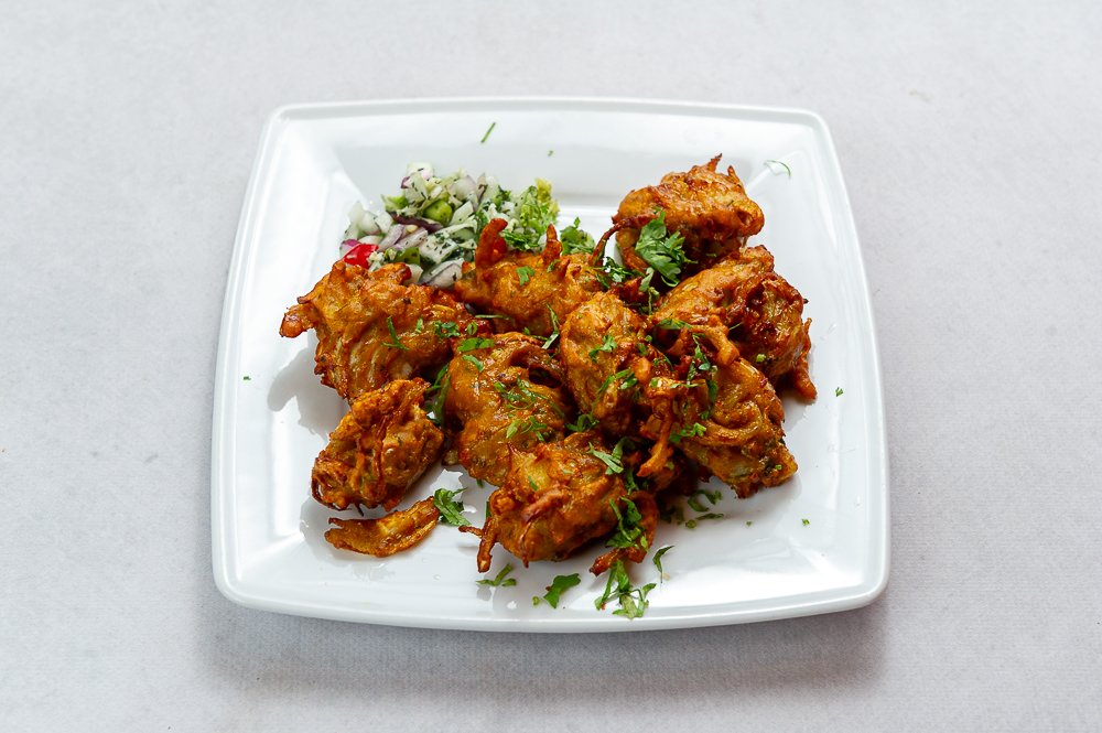 Indyjska przekąska w postaci smażonych na głębokim tłuszczu placuszków z cienko pokrojonej cebuli, wymieszanej z ciastem na bazie mąki z ciecierzycy i przypraw. Zdjęcie poglądowe