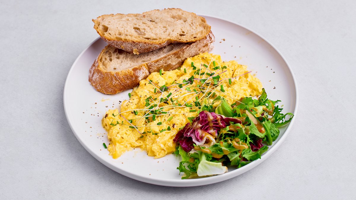 Kremowa, maślana jajecznica, pieczywo, sałata