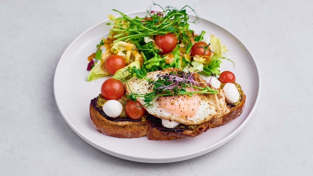 Pasta z czarnych oliwek, ser mozzarella, pomidor, jajo sadzone