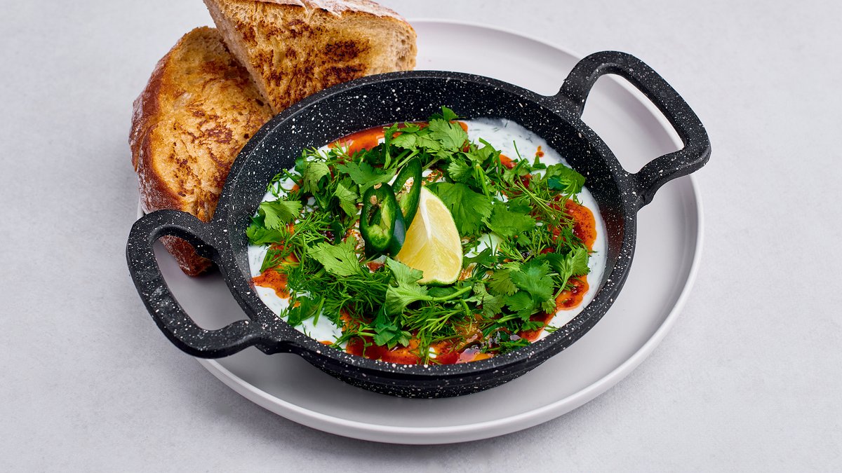 Jogurt, czosnek, koperek, palone masło chilli, jajka pochette, pieczywo