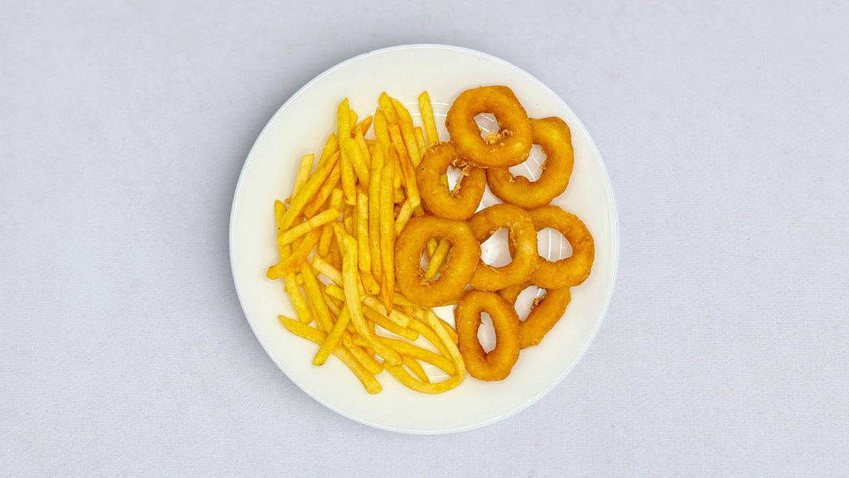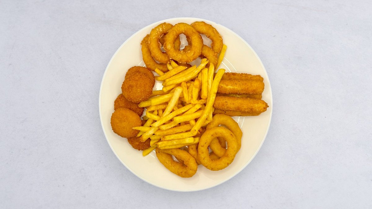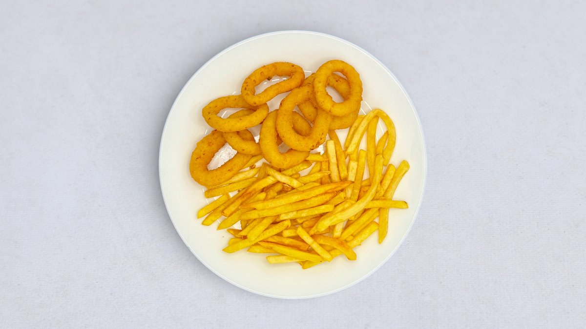 Podwójna porcja. Krążki cebulowe, kalmary, mozzarella sticks, camembert, frytki